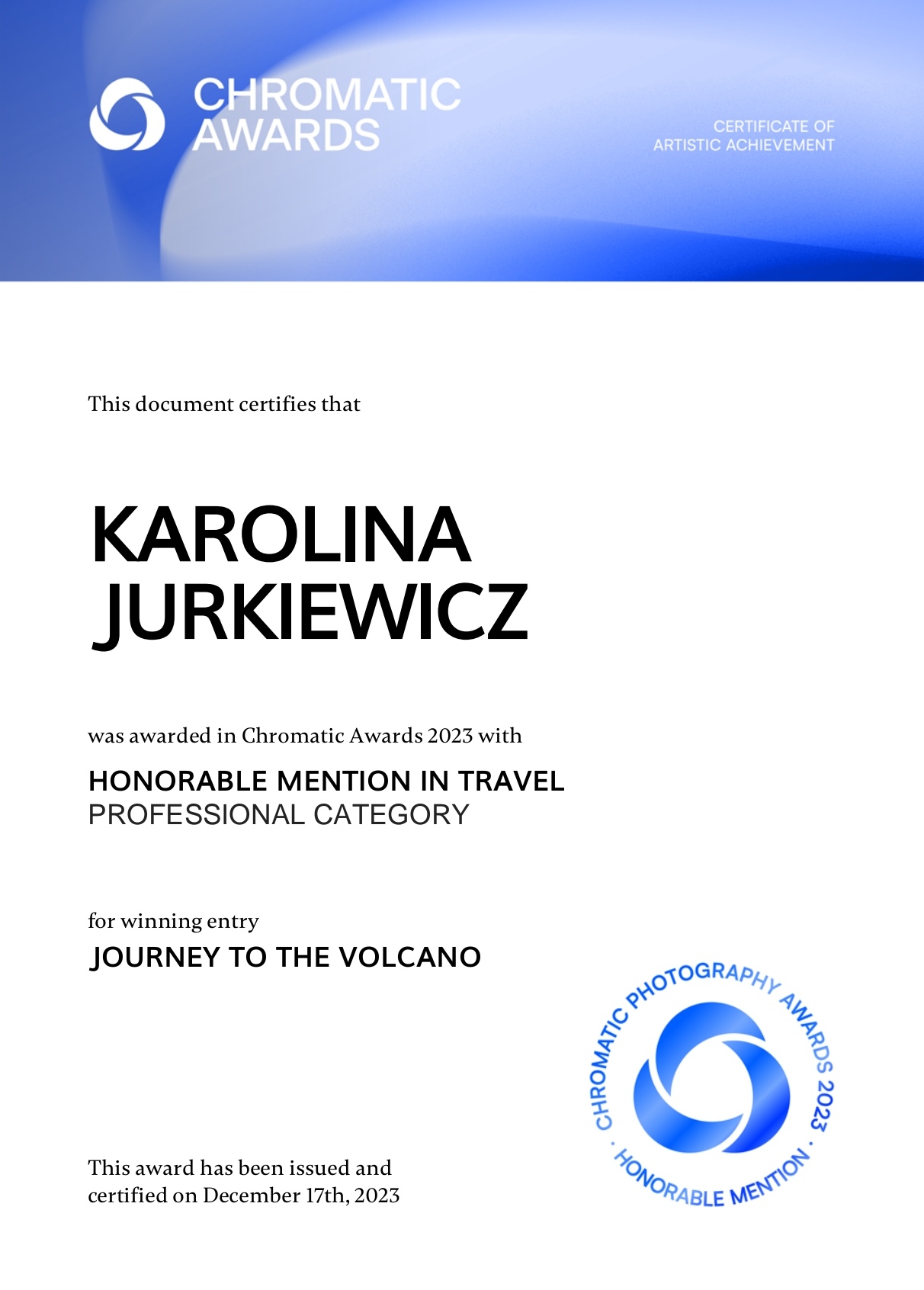 - Wyróżnienie honorowe w kategorii Krajobraz za zdjęcie „Icelandic landscape”.