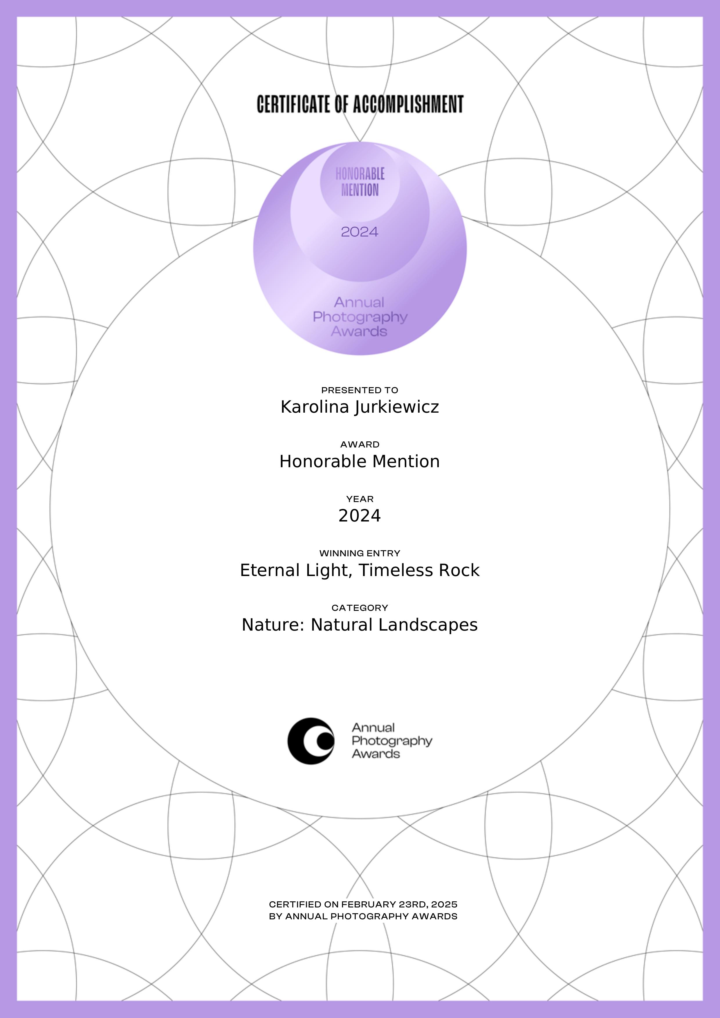 - Wyróżnienie honorowe w kategorii Natura za zdjęcie „Eternal Light, Timeless Rock”.